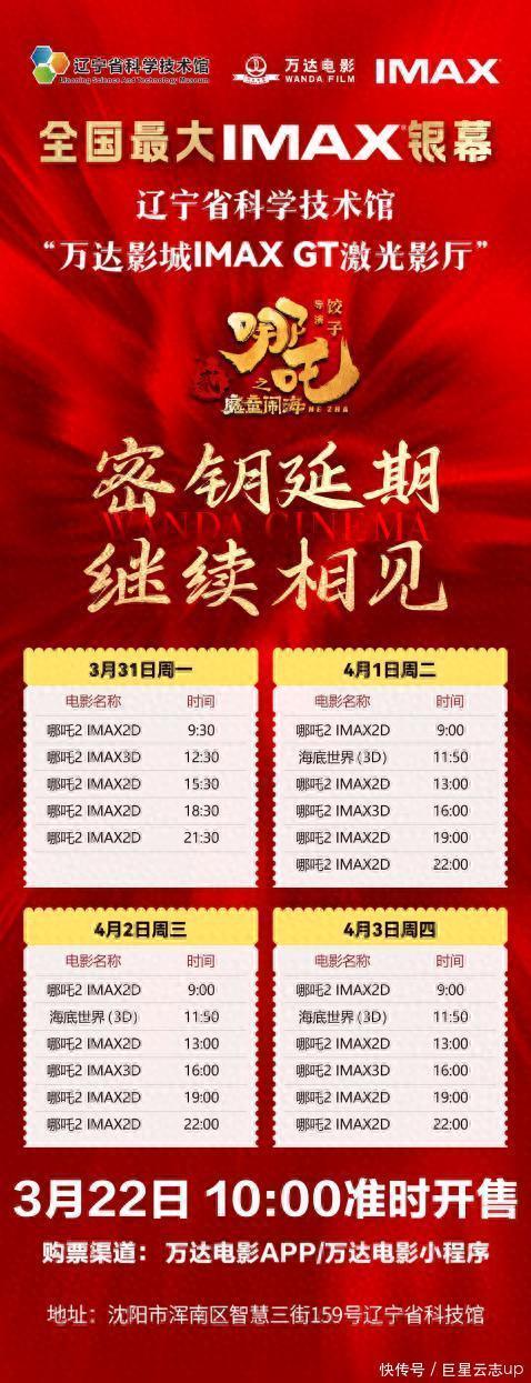 为满足大家的观影需求,拥有全国最大IMAX GT银幕的辽宁省科技馆持续发力,加开3月31日起至4月3日电影《哪吒2》场次,并于3月22日10点准时开售。届时大家可登录万达电影APP/小程序、猫眼、淘票票等平台,搜索“辽宁省科技馆‘万达影城IMAXGT双激光影厅’”选择场次购票!
